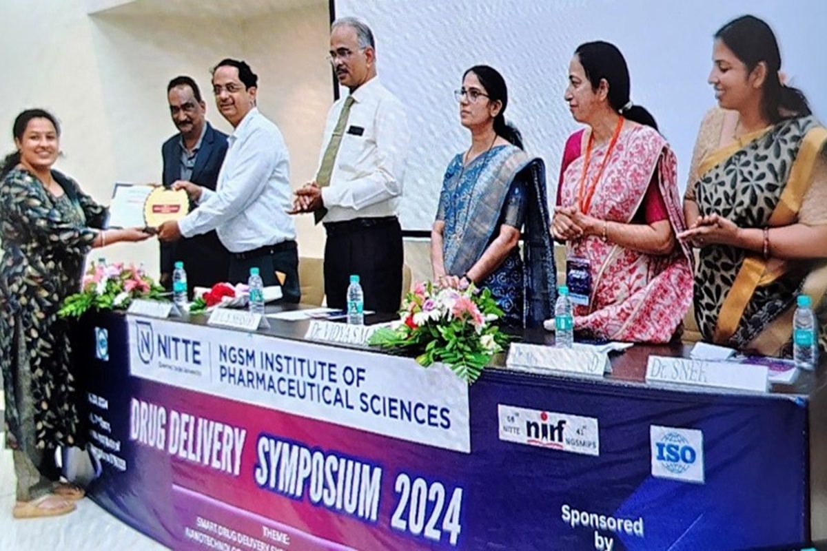 Dr. Likhitha U, Postdoctoral Fellow at MCOPS, MAHE, Manipal, received First Prize in the Oral Presentation for her research titled "Nanomesophase Encapsulation of Lapatinib for Breast Cancer Treatment: Development, computational simulation, pH-responsive release, and cellular evaluation" in The Drug Delivery Symposium (DDS-2024), organized by the Department of Pharmaceutics, NGSM Institute of Pharmaceutical Sciences, NITTE, Mangaluru, on August 22-23, 2024. The symposium focused on "Smart Drug Delivery Systems: Innovations in Nanotechnology, Biomaterials, and Medical Devices."