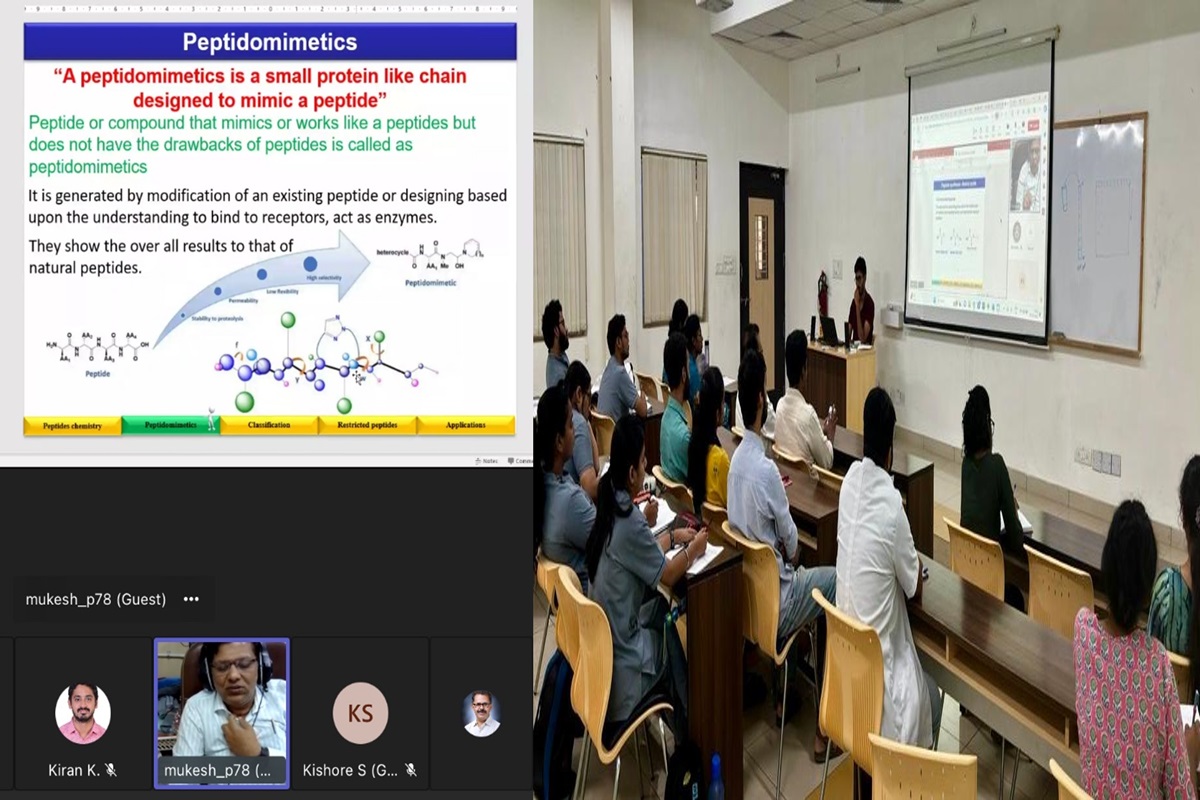 Department of Pharmaceutical Biotechnology, MCOPS organized a guest lecture on “Peptide Based Drugs” by Dr Mukesh Pasupuleti, Principal Scientist (Sc EII), Division of Molecular Microbiology and Immunology, CSIR - Central Drug Research Institute, Lucknow on 2 April 2024 via MS Teams. Head of the Department Dr Raghu Chandrashekar welcomed the speaker and the participants and Mr Kishore, Research Scholar, coordinated the talk.