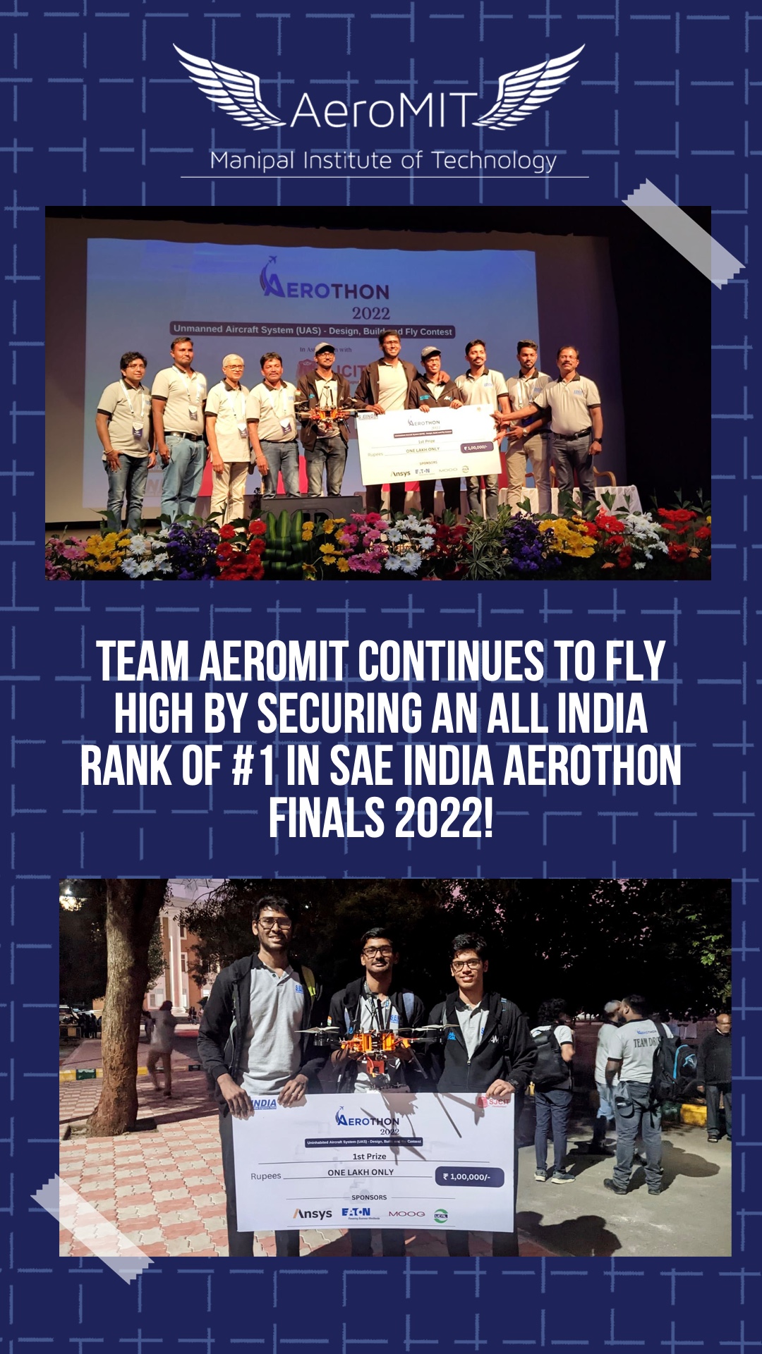 Team AeroMIT has successfully secured All India Rank #1 in the SAE INDIA Aerothon 2022 competition, held in Bangalore from 18th to 19th November 2022.