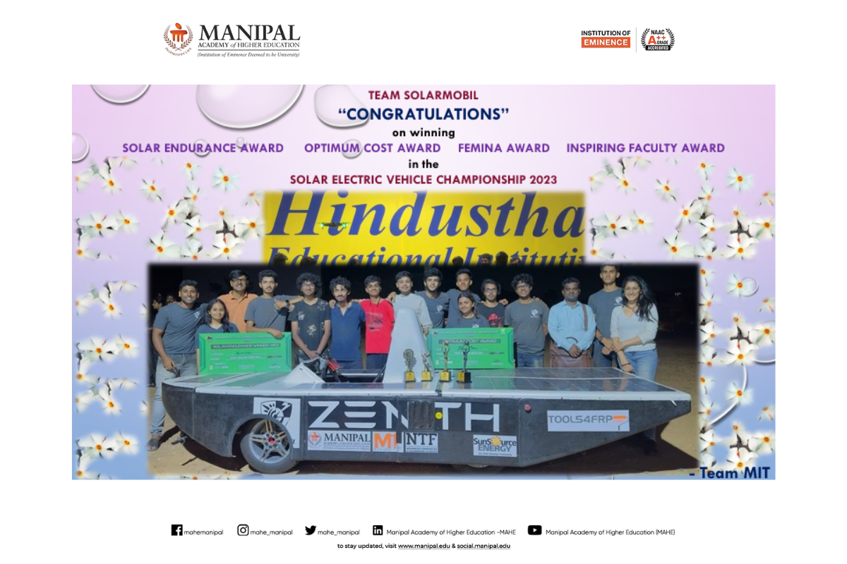 Team SolarMobil has won multiple awards in the Solar Electric Vehicle Championship from 29th March to 2nd April in Coimbatore, Tamil Nadu. The team reached #1 in Solar Endurance, #1 in Optimum Cost Presentation, Femina Award – M Aryaa Yadaw, and the Inspiring Faculty Advisor Award goes to Dr. Vijay Babu Koreboina.