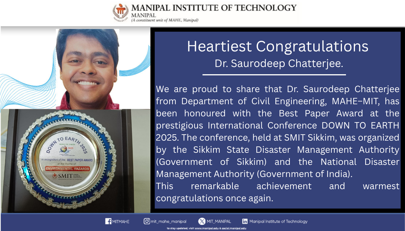 We proudly congratulate Dr. Raghavendra K. Holla, Faculty Member, Department of Civil Engineering, MIT Manipal, on being honored with the prestigious Anantha Mitra Kalabhavi Award. The award was conferred during the Engineers’ Day Celebrations and Techno Week program held at St. Sebastian Church Hall, Bendur, on 18th September 2025.