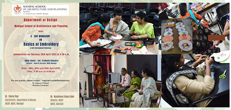 3-day workshop on Basics of Embroidery a skill development workshop has been conducted from 28th April to 30th April 2022, 9.30 am to 4.00 pm. The workshop was inaugurated by Col. Prakash Chandra, Director, General Services, MAHE, Chief Guest.t of the event, Dr. (Prof.) Nandineni Rama Devi, Director, MSAP, Dr. (Prof.) Veena Rao, Coordinator, DOD, MSAP, Ms. Nagaveni N Nayak, Workshop Coordinator, and Dr. Shwethapriya R, Department of Critical Care, KMC Manipal (one of the participants).