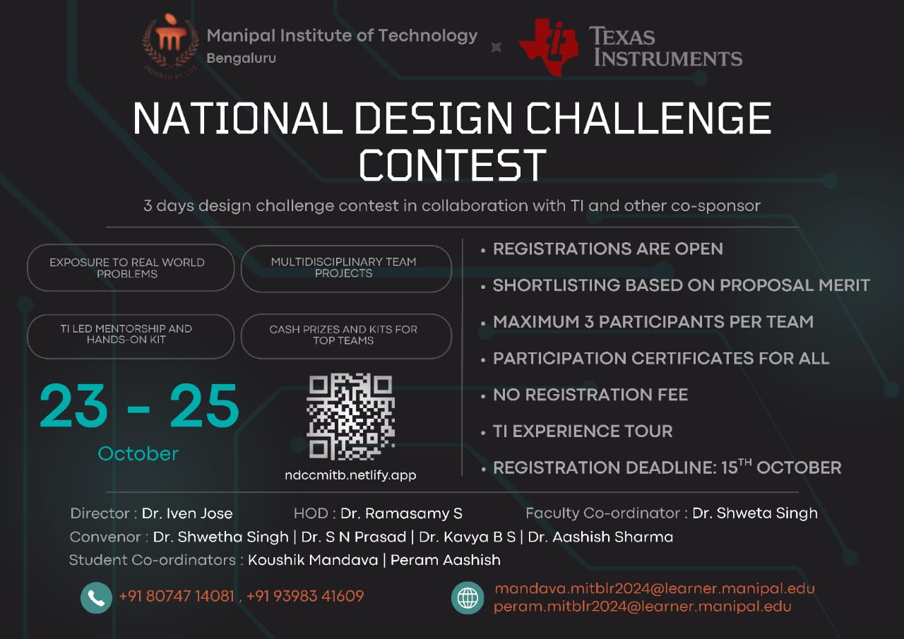 Organized the National Design Challenge Contest (NDCC) in collaboration with Texas Instruments, a 3-day multidisciplinary event that encouraged students to solve real-world engineering problems through innovative design solutions. The contest provided hands-on TI mentorship, project-based learning, and recognition for top-performing teams.