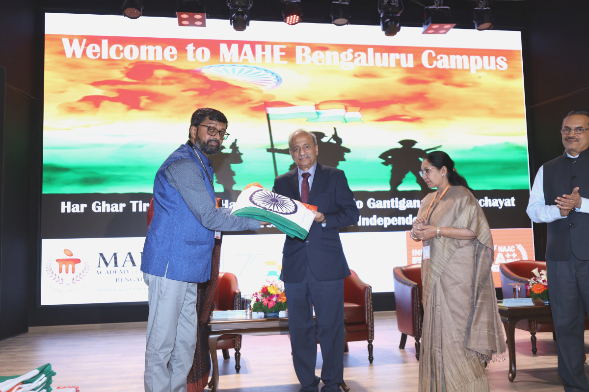 Chief Guest & Vice Chancellor Lt. Gen. (Dr.) M. D. Venkatesh hands over the Indian National Flag to various dignitaries. The Flag Handover Ceremony was held on Saturday, 6th August as part of the Har Gar Tiranga campaign under the Azadi Ka Amrit Mahotsav initiative.