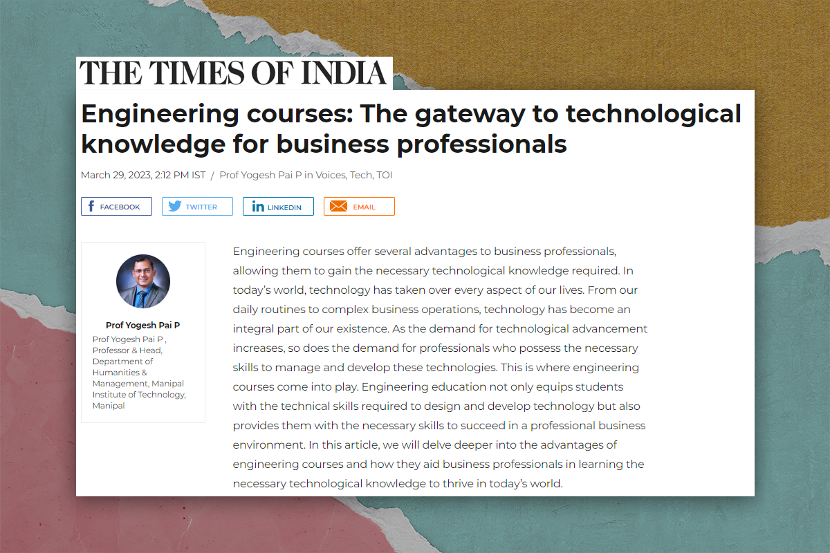 Manipal, 29th March 2023: The author's article, “Engineering courses: The gateway to technological knowledge for business professionals” by Prof Yogesh Pai P, Professor, and Head Department of Humanities and Management, Manipal Institute of Technology (MIT), Manipal.