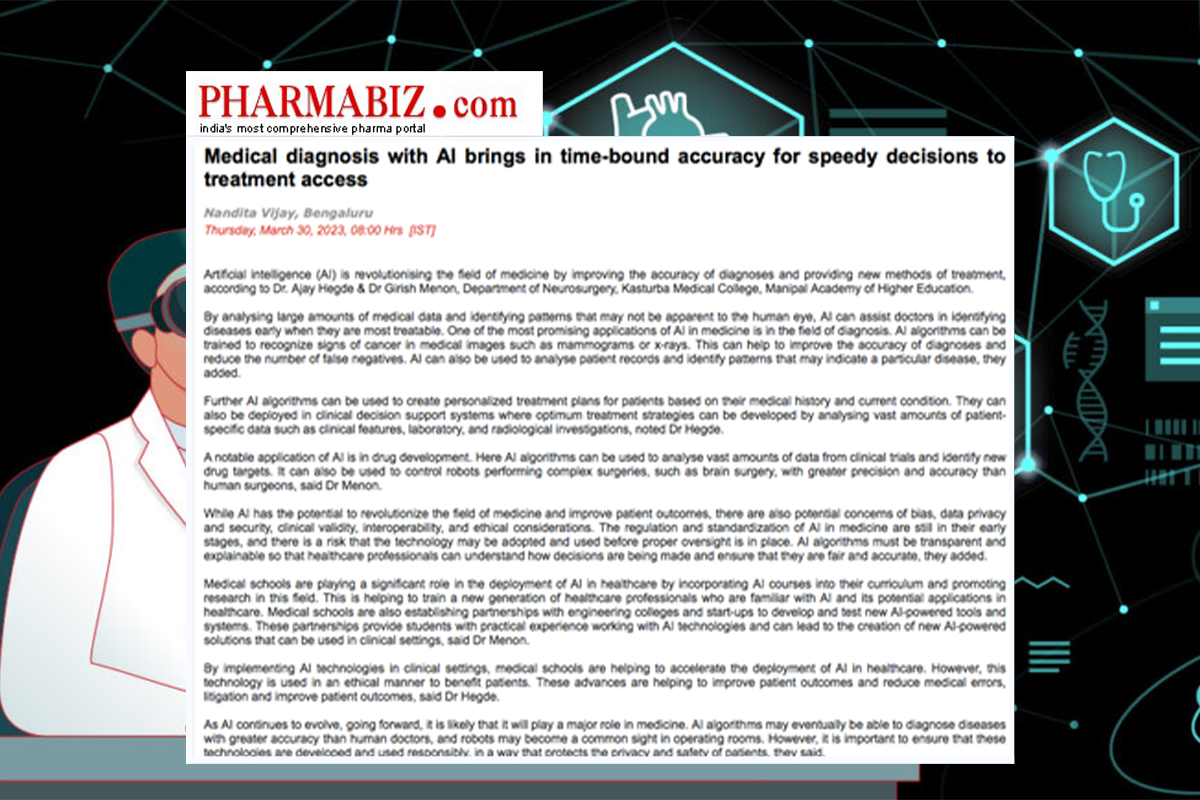 Manipal, March 30th, 2023: The author's article, "Medical diagnosis with AI brings in a time bound accuracy for speedy decisions to treatment access" by Dr. Ajay Hedge & Dr. Girish Menon, Department of Neurosurgery, Kasturba Medical College (KMC), Manipal.
