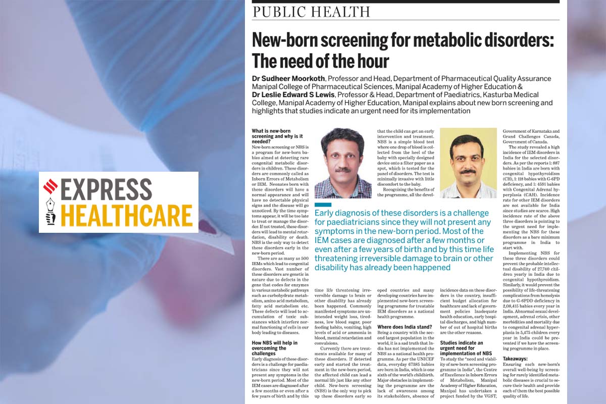 The author’s article, Newborn screening for metabolic disorders: The need of the hour, by Dr Sudheer Moorkoth, Professor and Head, Department of Pharmaceutical Quality Assurance MCOPS Manipal, and Dr Leslie Edward S Lewis, Professor & Head, Department of Paediatrics, KMC Manipal.