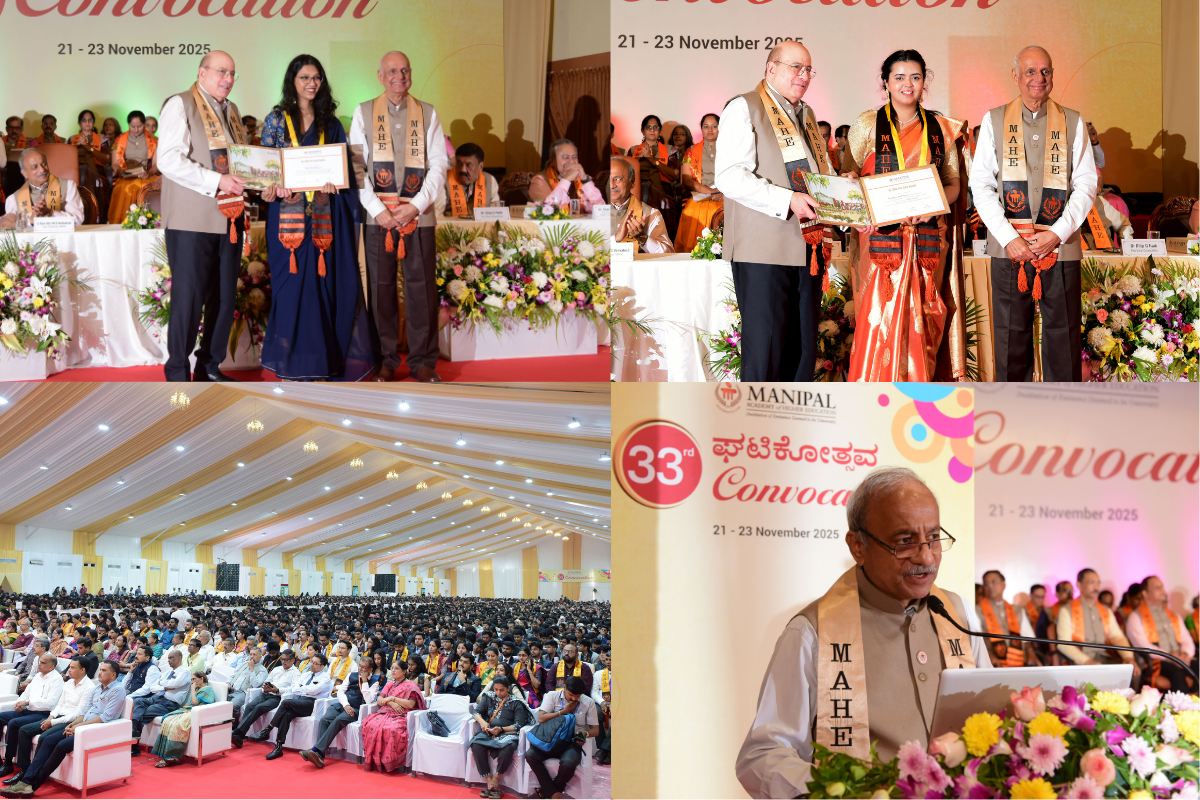 Manipal, 23rd November 2025: Manipal Academy of Higher Education (MAHE), Institution of Eminence Deemed to be university, concluded the third day of its 33rd Convocation on Sunday, 23 November 2025, in Manipal. The event highlighted MAHE’s commitment to nurturing competent graduates, encouraging transformative approaches, and promoting academic rigour and excellence across disciplines. On the third day of the convocation ceremony, 1,645 students received their degrees, including 58 PhD graduates, and 3 outstanding students were honored with the Dr. TMA Pai Gold Medal.