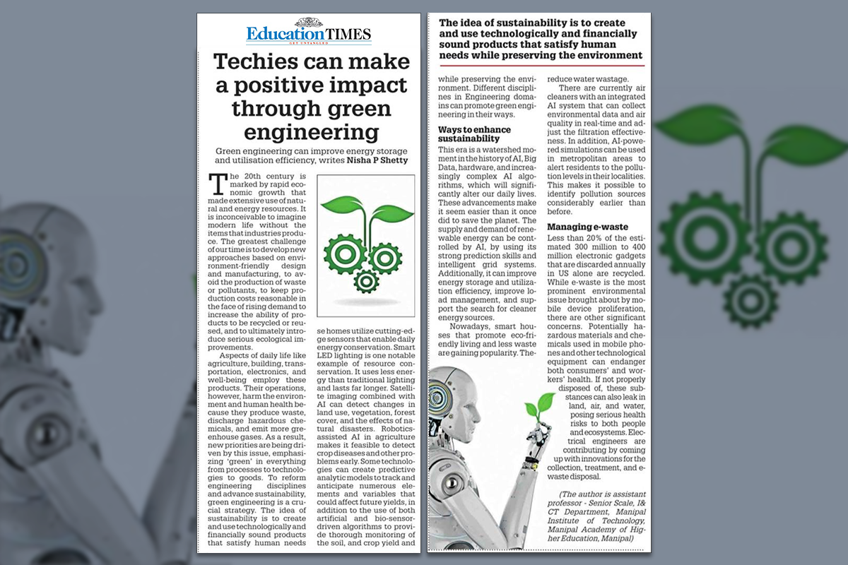Manipal, 16th May 2023: The author’s article, Techies can make a positive impact through Green Engineering, by Nisha P Shetty, Assistant Professor - I & CT Department, Manipal Institute of Technology (MIT), MAHE, Manipal.