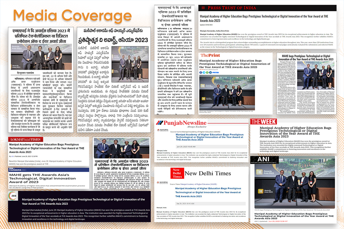 Manipal, 29th June 2023: Manipal Academy of Higher Education (MAHE) has won the prestigious award at THE Awards Asia 2023 for its exceptional achievements in higher education in Asia. The institution was awarded the highly esteemed Technological or Digital Innovation of the Year accolade at THE Awards Asia 2023. This recognition further solidifies MAHE's commitment to fostering innovation and excellence in the technology and digital landscape.