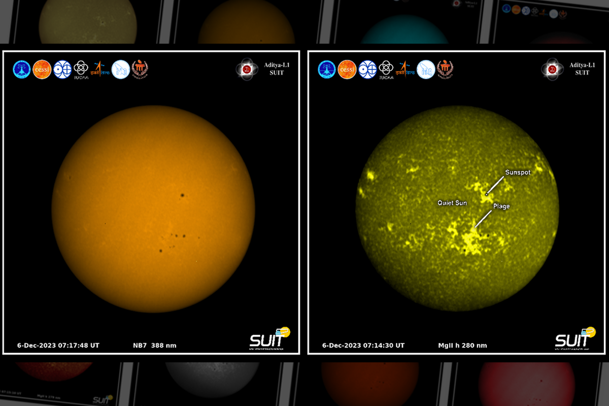 Two first light images from SUIT onboard Aditya-L1. The left image is taken in a spectral bandwidth peak transmission at 388nm and 1 nm bandwidth.  The right image is taken in Mg II h (280.3 nm with 0.4 nm bandwidth). The dark spots seen are known as sunspots, where the magnetic field strength is extremely high in the quiet sun region. The region around the n around the sunspot emits lots of UV radiation, especially in certain spectral bands like MgII h (as seen in the right-side image), and they are called plages. More such images can be seen on the ISRO website: https://www.isro.gov.in/Aditya_L1_SUIT.html