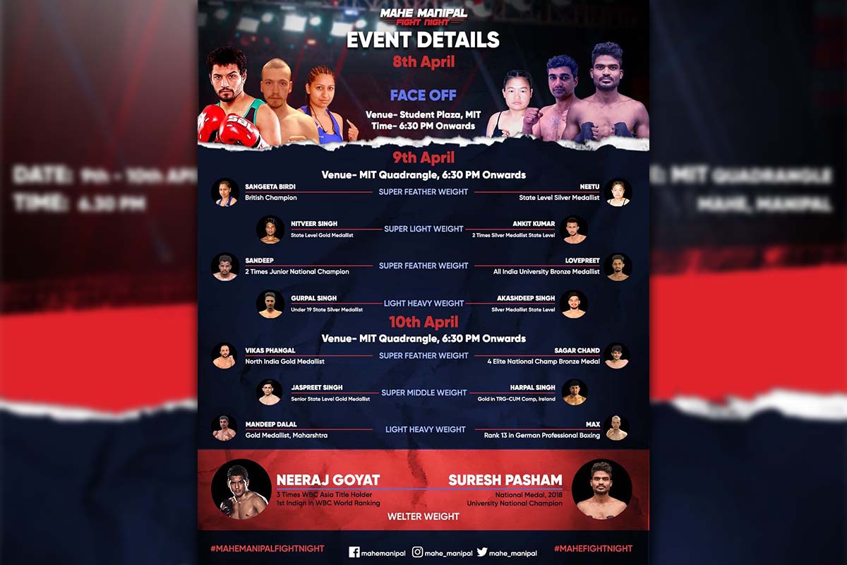 Manipal Academy of Higher Education (MAHE), Manipal will be organizing a first-of-its-kind professional boxing event, MAHE Manipal Fight Night. The event's theme is “Punch it before it knocks you out” (creating awareness on substance abuse). National and International professional boxers will participate in the mega boxing event. The face-off will be on 8th April 2022 at Student Plaza, MIT-Manipal.