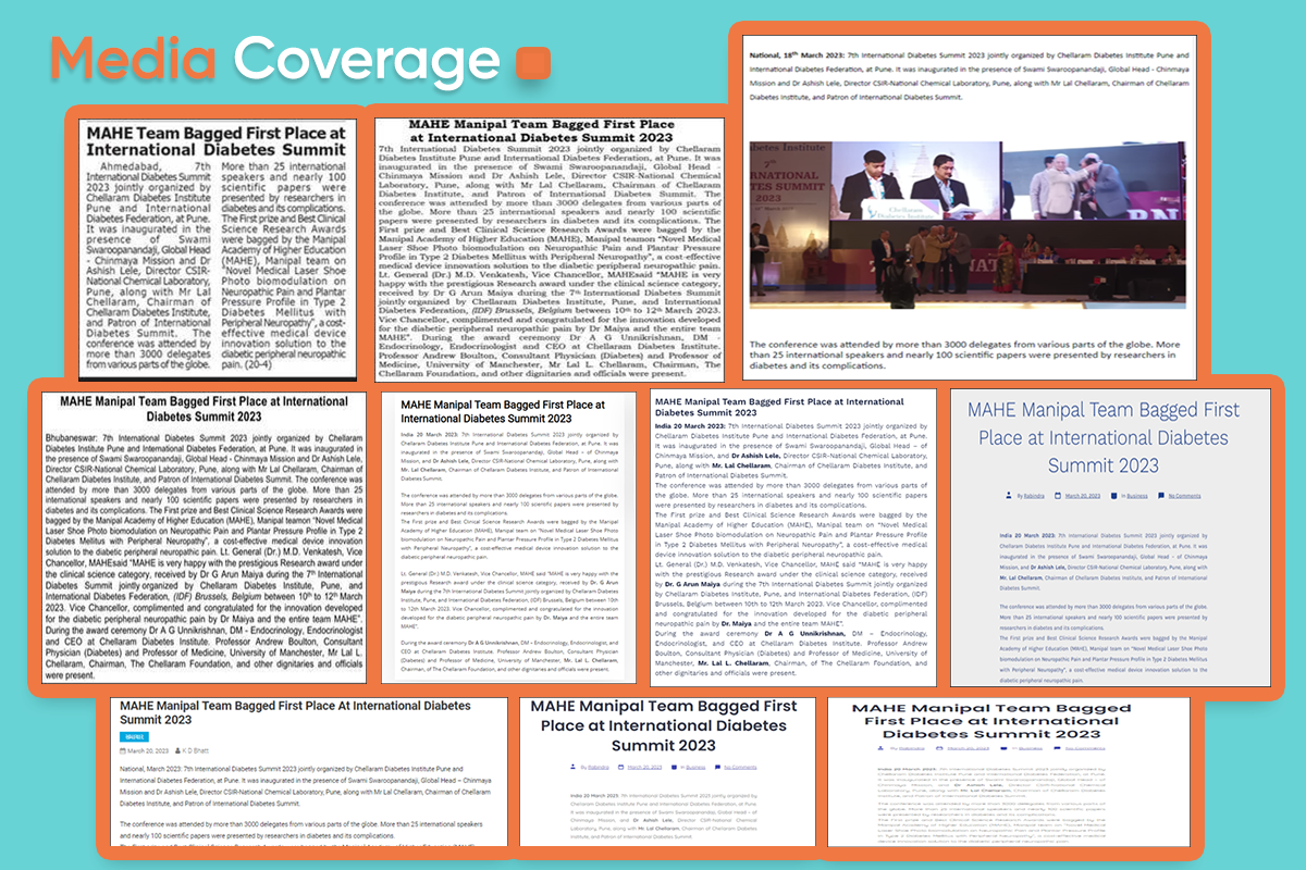 Lt. General (Dr.) M.D. Venkatesh, Vice Chancellor, MAHE said “MAHE is very happy with the prestigious Research award under the clinical science category, received by Dr G Arun Maiya during the 7th International Diabetes Summit jointly organized by Chellaram Diabetes Institute, Pune, and International Diabetes Federation, (IDF) Brussels, Belgium between 10th to 12th March 2023. Vice Chancellor, complimented and congratulated for the innovation developed for the diabetic peripheral neuropathic pain by Dr Maiya and the entire team MAHE”.