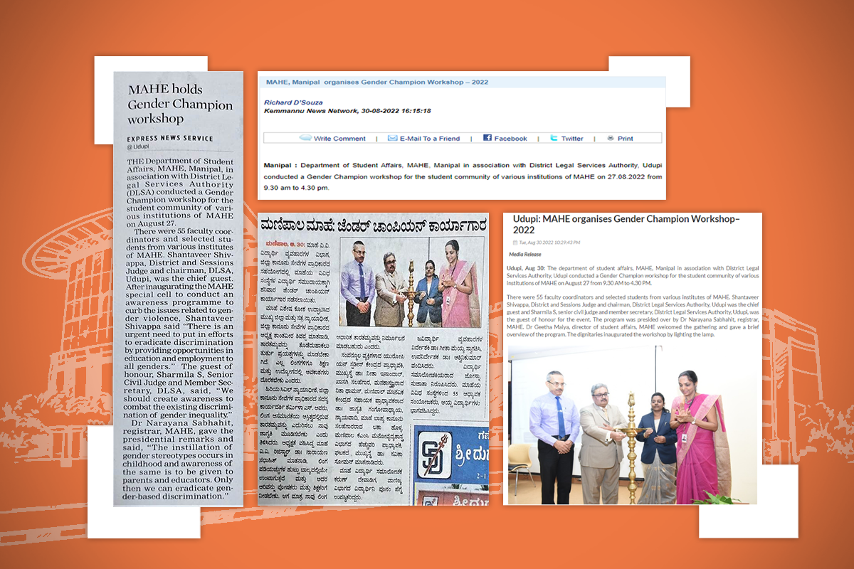 Department of Student Affairs, MAHE, Manipal in association with District Legal Services Authority, Udupi conducted a Gender Champion workshop for the student community of various institutions of MAHE on 27.08.2022.