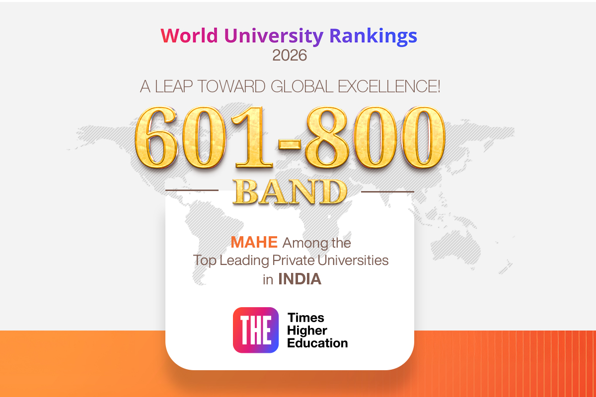Manipal, October 11, 2025 – Manipal Academy of Higher Education (MAHE), an Institution of Eminence Deemed to be University, has achieved a significant milestone in the Times Higher Education (THE) World University Rankings 2026, advancing from the 801-1000 band (2025) to the 601-800 band (2026). This notable improvement reflects MAHE's strengthened research ecosystem, enhanced teaching environment, and growing global reputation.