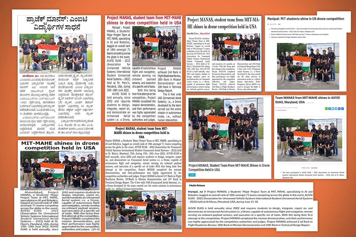 Manipal July 07th, 2022: Project MANAS, a Students’ Major Project Team at MIT, MAHE, specializing in AI and Robotics, bagged an overall rank of 18th amongst 71 teams competing across the globe in the event, AUVSI SUAS - 2022 (Association for Unmanned Vehicle Systems International Student Unmanned Aerial Systems – 2022) held at St. Mary's, Maryland, USA, during 15th -18th June 2022.