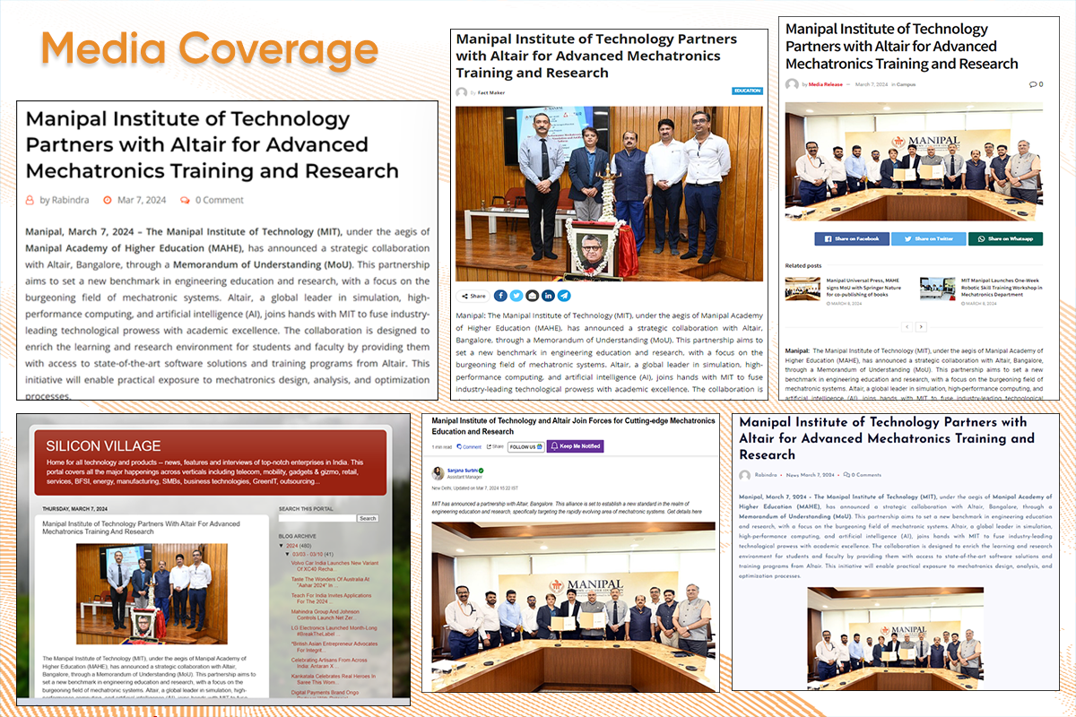 Manipal, March 6, 2024 - The Manipal Institute of Technology (MIT), under the aegis of Manipal Academy of Higher Education (MAHE), has announced a strategic collaboration with Altair, Bangalore, through a Memorandum of Understanding (MoU). This partnership aims to set a new benchmark in engineering education and research, with a focus on the burgeoning field of Mechatronic systems. Altair, a global leader in simulation, high-performance computing, and artificial intelligence (AI), joins hands with MIT to fuse industry-leading technological prowess with academic excellence. The collaboration is designed to enrich the learning and research environment for students and faculty by providing them with access to state-of-the-art software solutions and training programs from Altair. This initiative will enable practical exposure to mechatronics design, analysis, and optimisation processes.