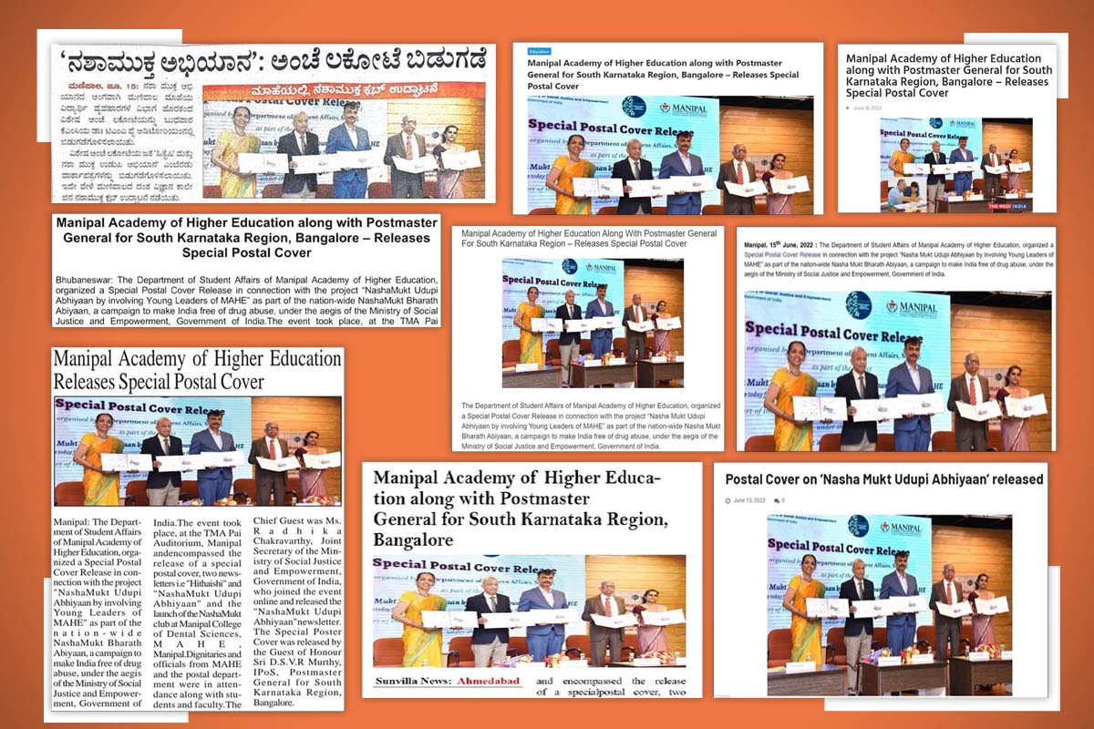 The event took place, at the TMA Pai Auditorium, Manipal, and encompassed the release of a special postal cover, two newsletters i.e “Hithaishi” and “Nasha Mukt Udupi Abhiyaan” and the launch of the Nasha Mukt club at Manipal College of Dental Sciences, MAHE, Manipal. Dignitaries and officials from MAHE and the postal department were in attendance along with students and faculty.