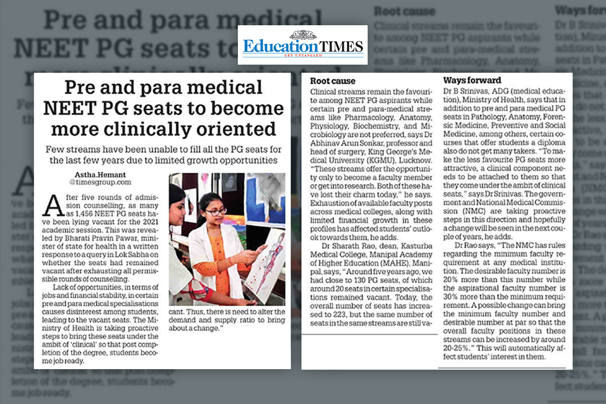 Manipal, 1st August 2022: Dr. Sharath K Rao speaks about the need for pre, and para-medical NEET PG seats to become more clinically oriented as the lack of opportunities in terms of job and financial stability is causing disinterest among students. Dr Sharath Rao explains that the proportion of seats that remain vacant has increased, and there is a need to change the demand-supply ratio to bring about a change; he also says there is a need to increase the number of faculty in these streams as well.