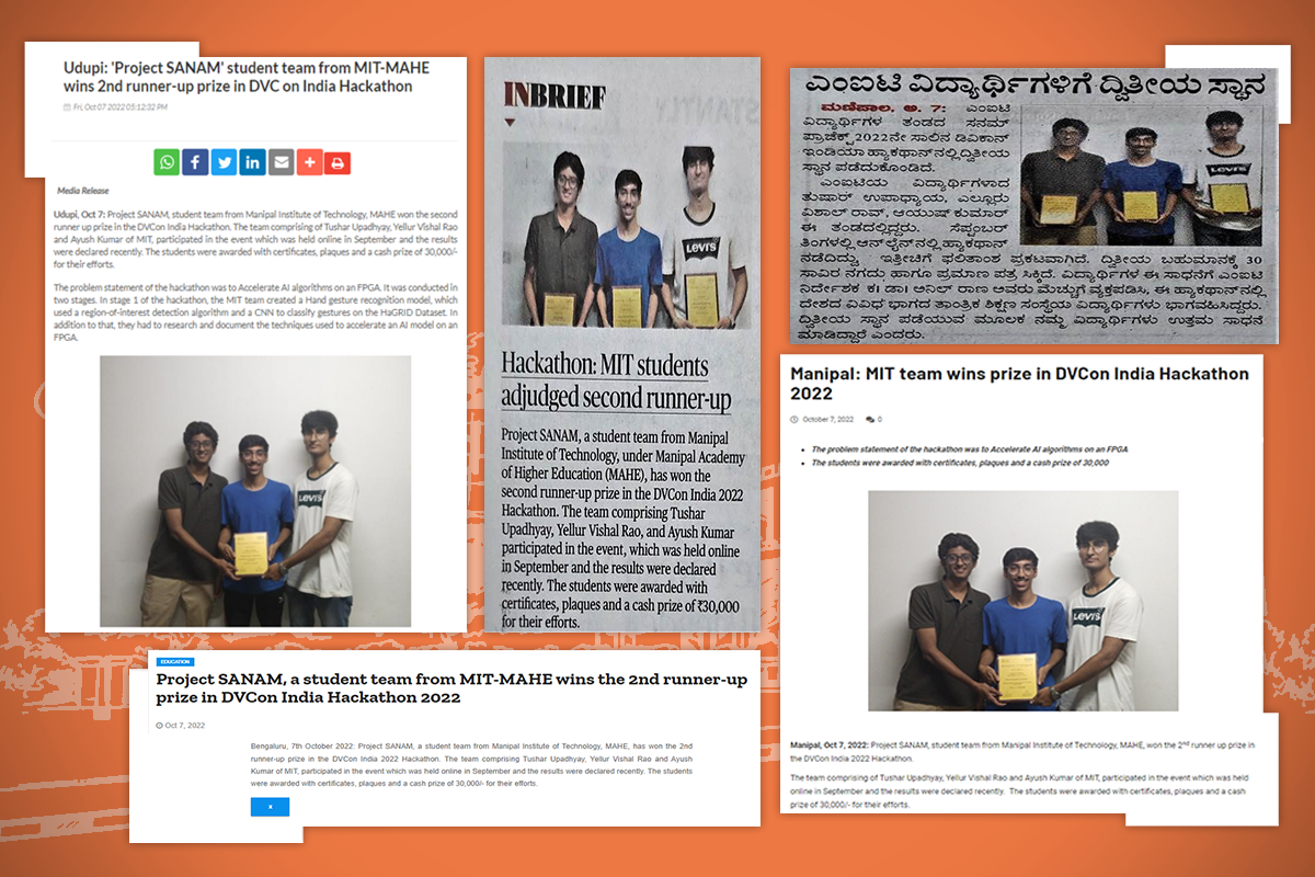 Manipal, 7th October 2022: Project SANAM, the student team from Manipal Institute of Technology, MAHE, has won the 2nd runner-up prize in the DVCon India 2022 Hackathon. The team comprising Tushar Upadhyay, Yellur Vishal Rao, and Ayush Kumar of MIT, participated in the event which was held online in September and the results were declared recently. The students were awarded certificates, plaques, and a cash prize of 30,000/- for their efforts.