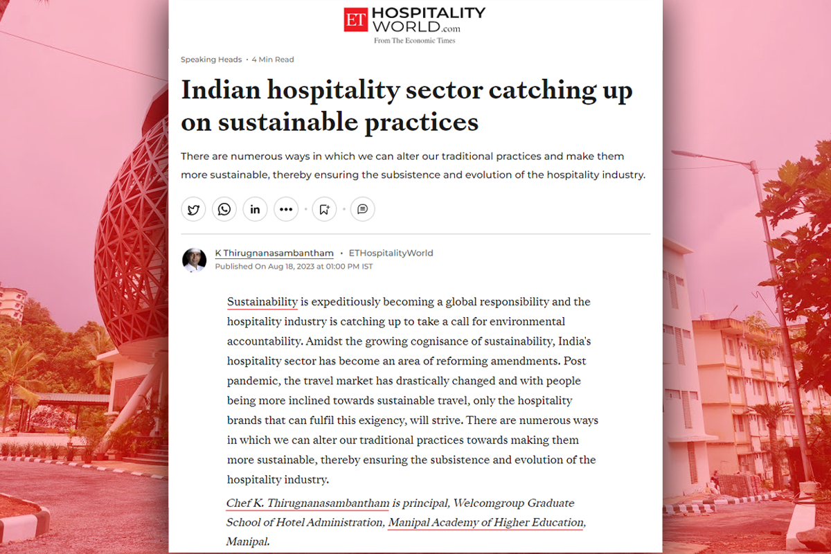 Manipal; 18 August 2023: The author’s article, Indian Hospitality Sector Catching up on Sustainable Practices, by Dr Chef K. Thirugnanasambantham, Principal, Welcomgroup Graduate School of Hotel Administration, MAHE, Manipal.