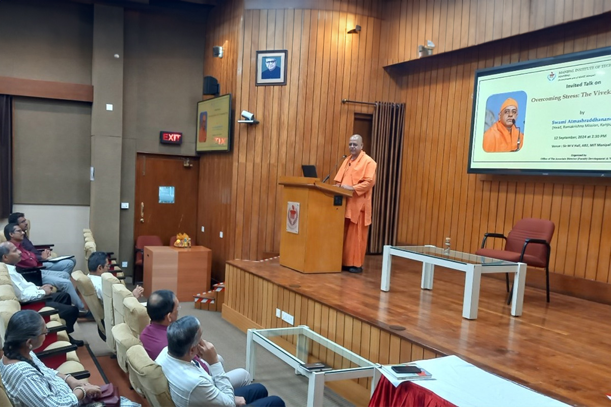 Manipal, 13th September 2024: Swami Atmashriddhananda, Head of the Ramakrishna Mission Ashrama, Kanpur, inspired students, faculty, and staff at the Manipal Institute of Technology (MIT)  with his lecture titled “Overcoming Stress – The Vivekananda Way”.