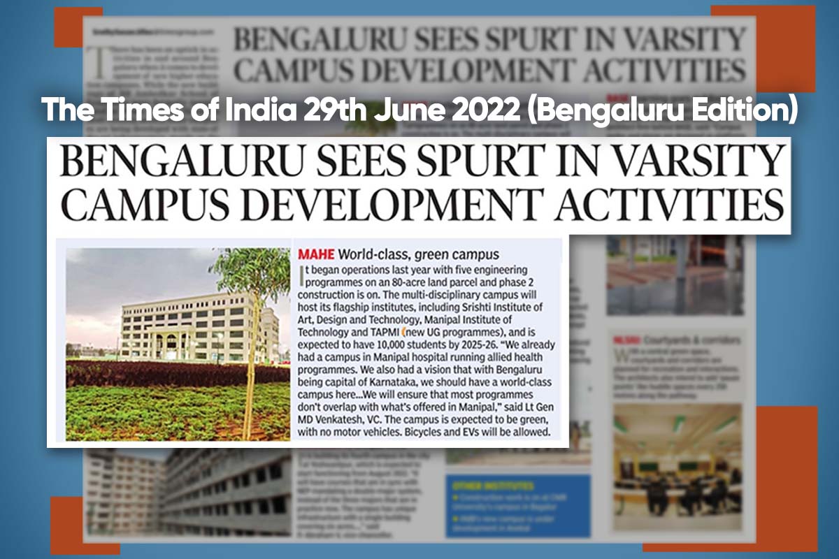 It began operations last year with five engineering programmes on an 80-acre land parcel and phase 2 construction is on. The multi-disciplinary campus will host its flagship institutes, including Srishti Institute of Art, Design and Technology, Manipal Institute of Technology, and TAPMI (new UG Programmes), and is expected to have 10.000 students by 2025-26. "We already had a campus in Manipal hospital running allied health programmes. We also had a vision that with Bengaluru being the capital of Karnataka, we should have a world-class campus here...We will ensure that most programmes don't overlap with what's offered in Manipal," said Lt Gen M.D. Venkatesh, VC. The campus is expected to be green, with no motor vehicles. Bicycles and EVs will be allowed.