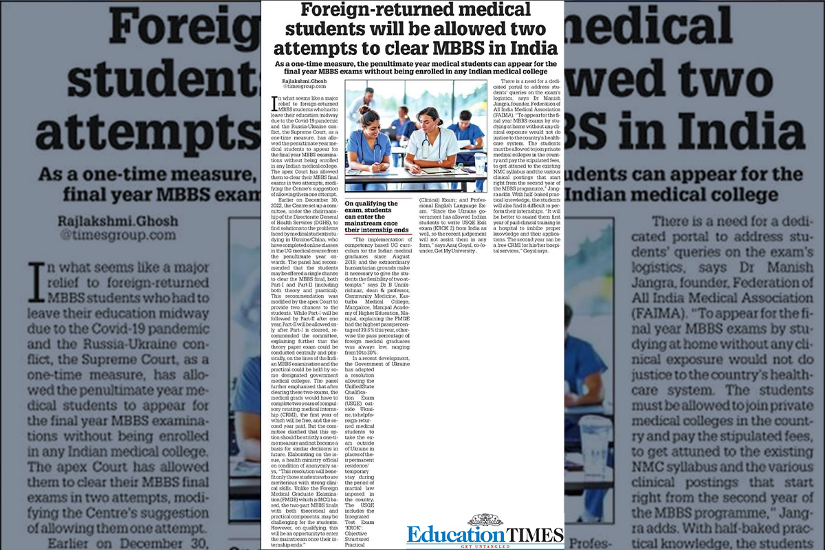 Manipal, 10th April 2023: Dr. B Unnikrishnan, Dean & Professor of Community Medicine, Kasturba Medical College (KMC), Mangalore, shared his views on “Foreign-returned medical students will be allowed two attempts to clear MBBS in India” with Education Times (TOI).