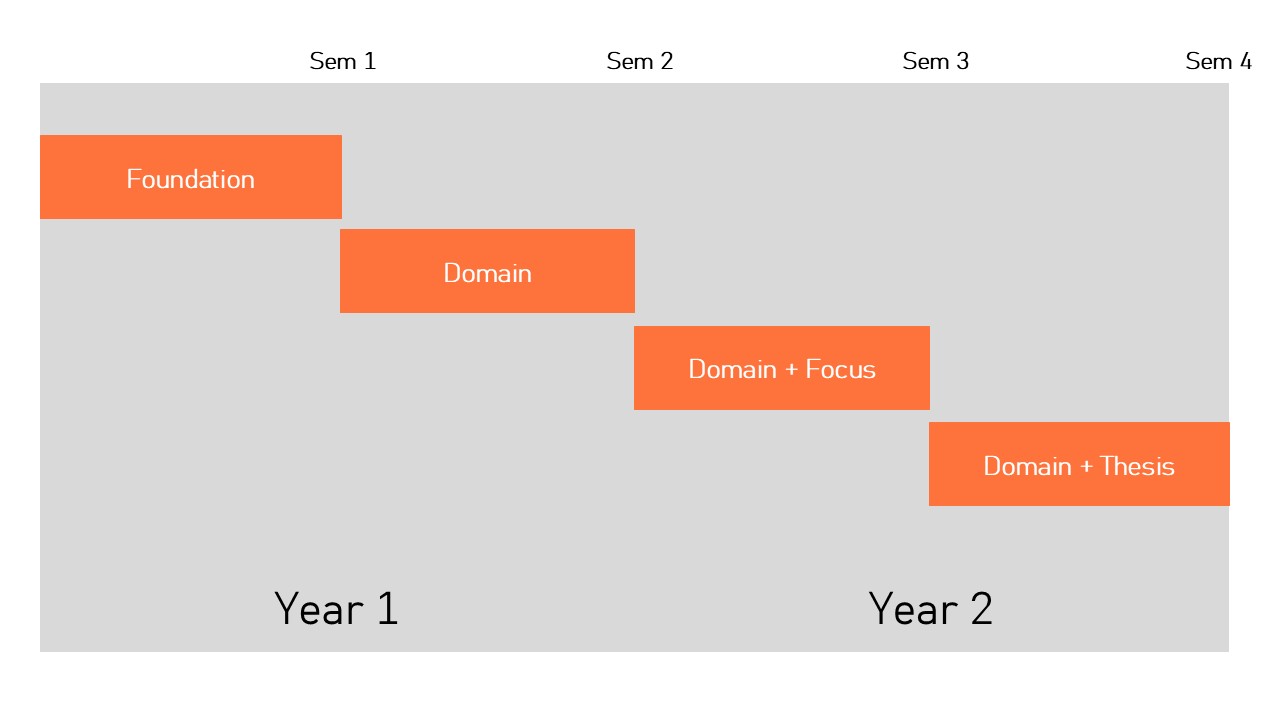The first semester exposes the students to all five domains through five foundation courses that orient them to the latest methodologies in the humanities and social sciences.