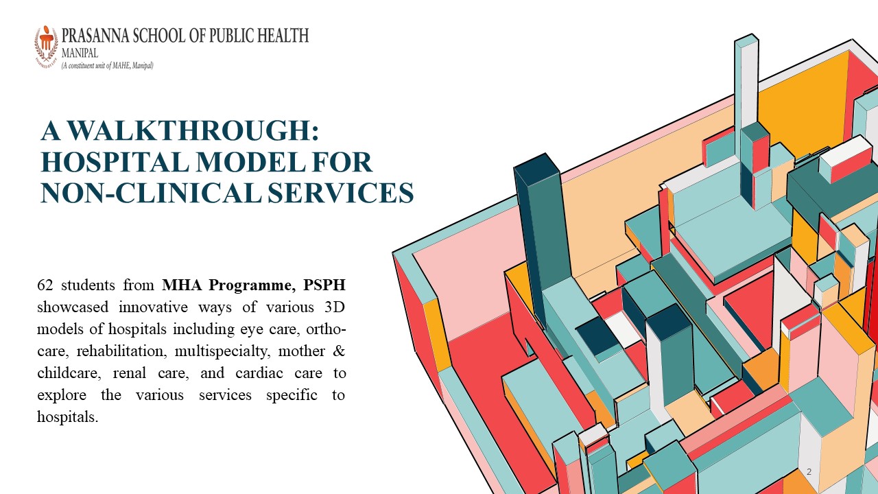 The programme was coordinated and students were mentored by MHA faculty Dr. Usha Rani, under Dr. Somu G, coordinator- MHA Programme, PSPH, MAHE. Through the programme, students developed confidence in establishing functional relationships and layout of various departments in the hospitals. Students learned from their peers through team while conceptualizing various models and exploring innovative ideas. This innovative initiative for teaching, learning and assessment method was designed as part of student assessment.