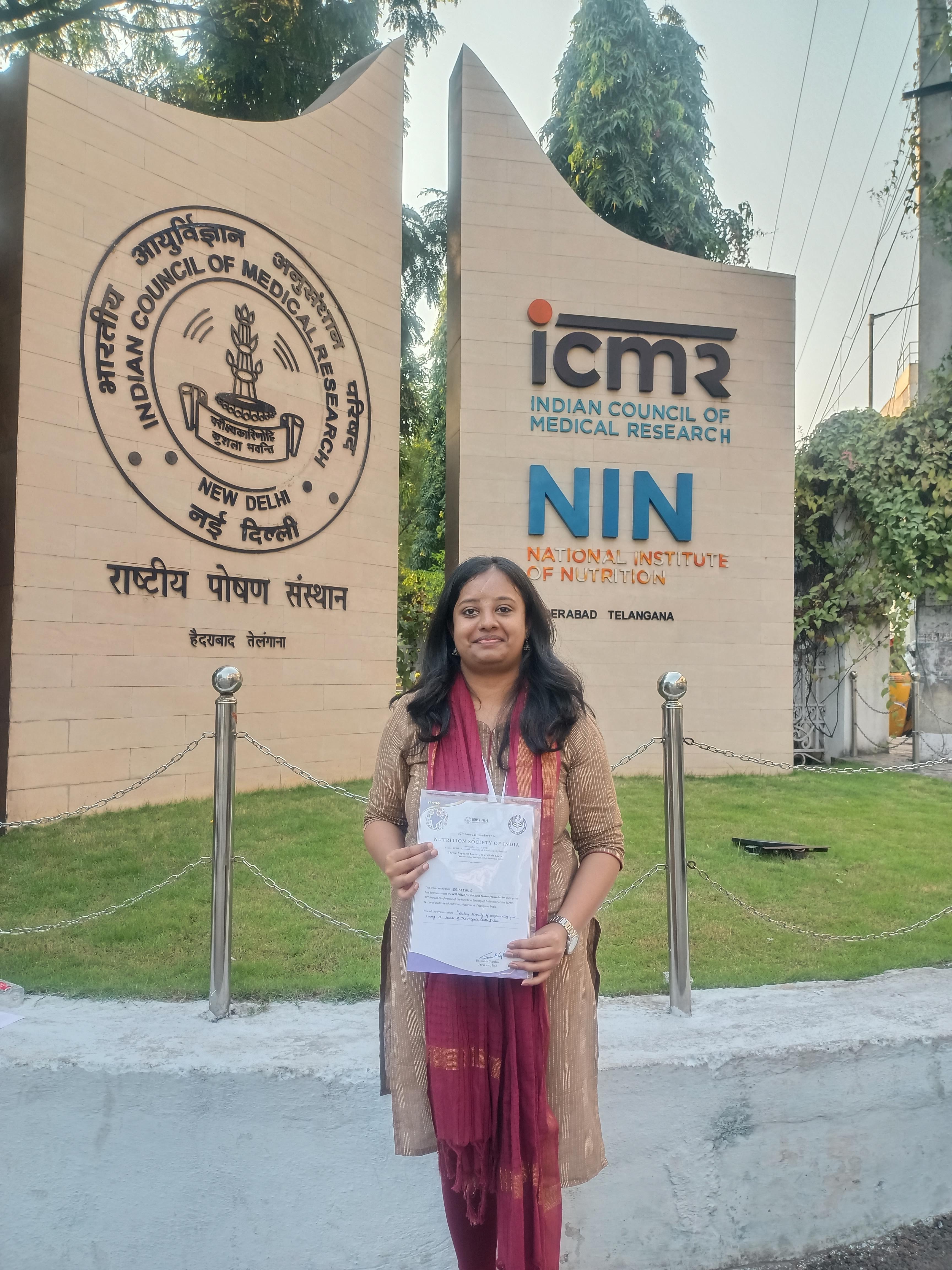Dr Rithu S won the Best Poster Presentation Award for her research titled 'Dietary diversity of complementary food among the tribes of The Nilgiris, South India' at the 57th Annual Conference of the Nutrition Society of India conducted at ICMR-National Institute of Nutrition, Hyderabad held on November 14-15, 2025. Supervised by Dr Arathi P Rao, this study reflected on the gaps in dietary diversity of complementary food fed to tribal children below two years of age in The Nilgiris district of Tamil Nadu."