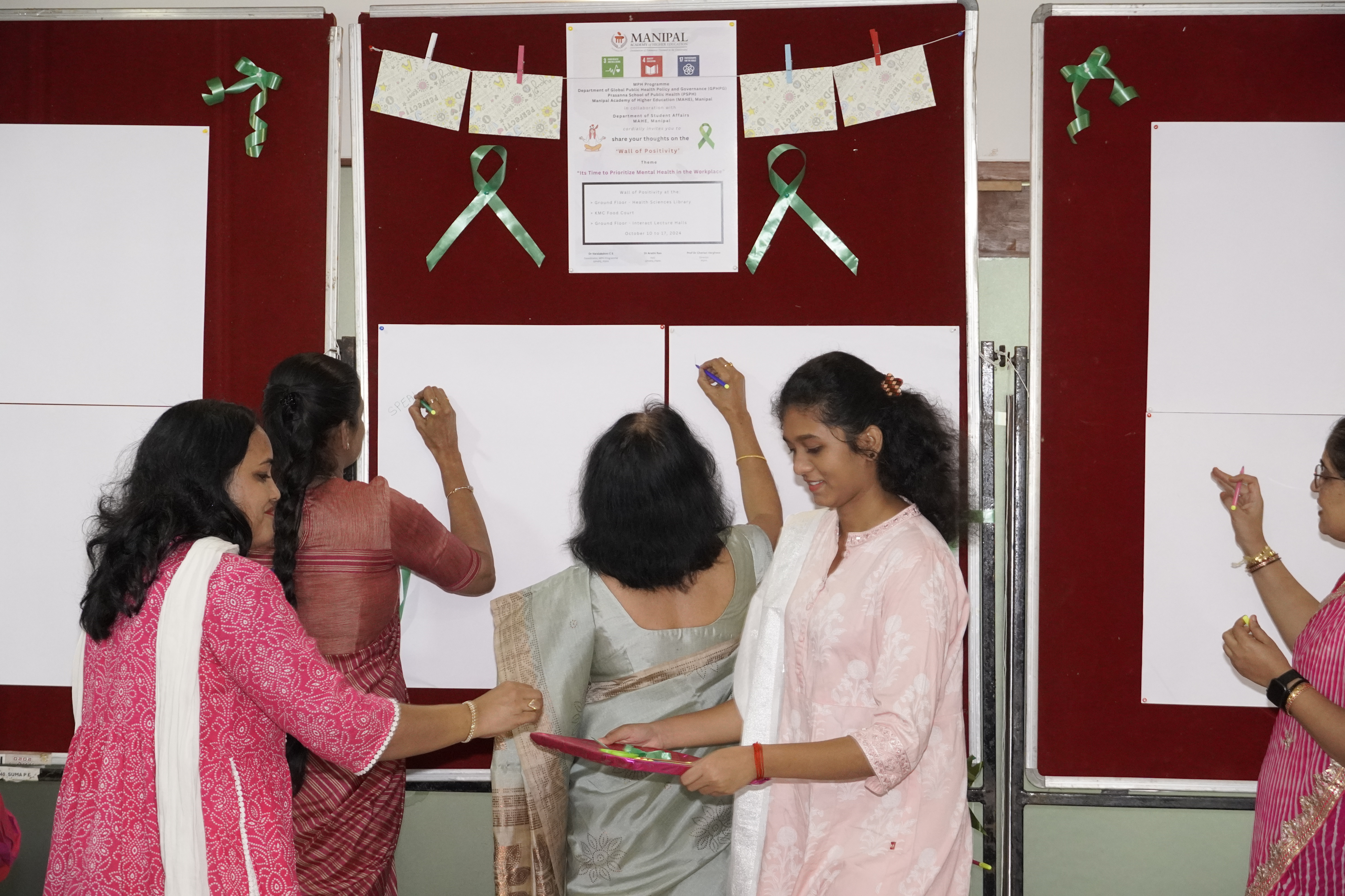 MPH Programme, Department of Global Public Health Policy and Governance (GPHPG), Prasanna School of Public Health (PSPH), Manipal Academy of Higher Education (MAHE), Manipal in collaboration with the Department of Student Affairs, MAHE, Manipal organised a Mental Health Awareness event on the occasion of World Mental Health Day (October 10, 2024) from October 10 to 19, 2024 – Share Your Thoughts on the ‘Wall of Positivity’ based on the Theme – “Its Time to Prioritize Mental Health in the Workplace”.