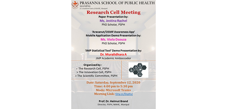 A Research Cell Meeting of Prasanna School of Public Health (PSPH), MAHE, Manipal will be held on September 12, 2020 from 4:00 pm to 5:30 pm through Microsoft Teams. The meeting will be organized by The Research Cell, PSPH; The Innovation Cell, PSPH; The Scientific Committee, PSPH. In the Research Cell Meeting, Paper Presentation will be done by Ms. Jestina Rachel (PhD Scholar, PSPH), 'Arecanut/OSMF Awareness App' Mobile Application Demo Presentation will be done by Ms. Viola Dsouza (PhD Scholar, PSPH), 'JMP Statistical Tool' Demo Presentation will be done by Dr. Muralidhara A (JMP Academic Ambassador).