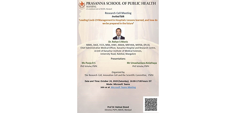 The Research Cell together with Innovation Cell and the Scientific Committee of PSPH are organizing a meeting through Microsoft Teams during 16:00-17:00 hours IST of October 24, 2020 (Saturday). Dr. Rohan S Monis (Chief Administrative Medical Officer, Kanachur Hospital and Research Centre, A Unit of Kanachur Institute of Medical Sciences, University Road, Natekal, Mangalore) will deliver an invited talk on ‘Leading Covid-19 Management in Hospitals: Lessons learned, and how do we be prepared in the future’. This will be followed by presentations by scholars of PSPH.