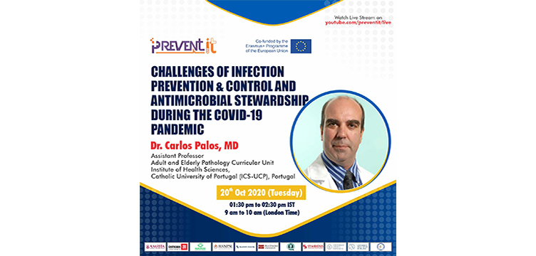 As part of the PREVENT IT project (Erasmus+ of European Commission), PSPH, MAHE, Manipal is Organizing a Webinar on “Challenges of Infection Prevention & Control and Antimicrobial Stewardship during the COVID-19 Pandemic " on October 20, 2020 (time 1:30 pm to 2:30 pm, Indian Standard Time). Dr. Carlos Palos (Assistant Professor, Adult and Elderly Pathology Curricular Unit, Institute of Health Sciences, Catholic University of Portugal [ICS-UCP], Portugal) will be the Presentor during the Webinar.