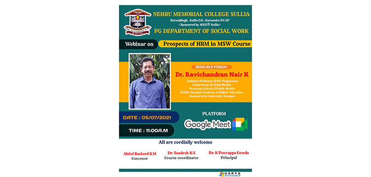 Dr Ravichandran Nair K (Faculty, MSW Program, Department of Global Health, PSPH) was the resource person for the webinar "Prospects of HRM in MSW Course" organized by the PG Department of Social Work, Nehru Memorial College, Sullia, Karnataka on July 05, 2021.