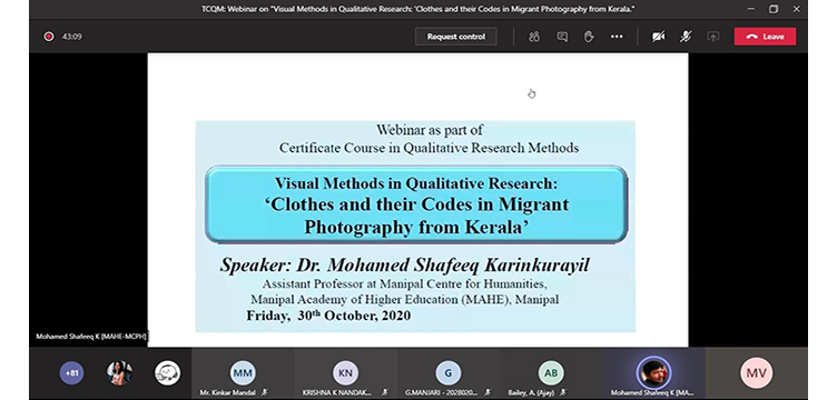 The Transdisciplinary Centre for Qualitative Methods (TCQM), Department of Health Information organized a webinar on ‘Visual Methods in Qualitative Research: Clothes and their codes in migrant Photography from Kerala’.