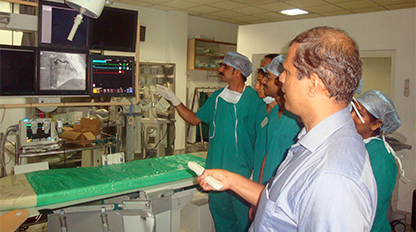 The department is fully equiped with catheterization lab setup in which various invasive cardiovascular interventions conducted. In addition Electrophysiological studies, Radiofrequency ablation & 3D mapping are performed by technically skilled EP specialists. Non invasive cardiac procedures includes 2 Dimesional & doppler echocardiography, Electrocardiography, Head Up Tilt Table Test, Treadmill test & 24 hours Ambulatory BP & ECG moniotoring.