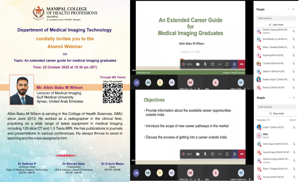 Department of Medical Imaging Technology, MCHP, MAHE, Manipal organised webinar. Mr. Mr. Albin Babu M Wilson from Gulf Medical University, UAE delivered a talk on " An extended career guide for Medical Imaging graduates ", on 22.10.2022, 10:30-11:30 am through Microsoft teams. He Secured master’s degree in Medical Imaging Technology from SOAHS, Manipal University, Udupi, Karnataka in the year 2011 is currently working as Lecturer, Gulf Medical University, Ajman, UAE. The webinar was attended by department alumni, students, and faculty member of our Institute. Dr.Saikiran. P, Incharge Head, Department of Medical Imaging Technology, MCHP Manipal welcomed the speaker and Mr.Visakh T, Dept. Alumni Co-ordinator, Medical Imaging Technology, MCHP proposed the vote of thanks.