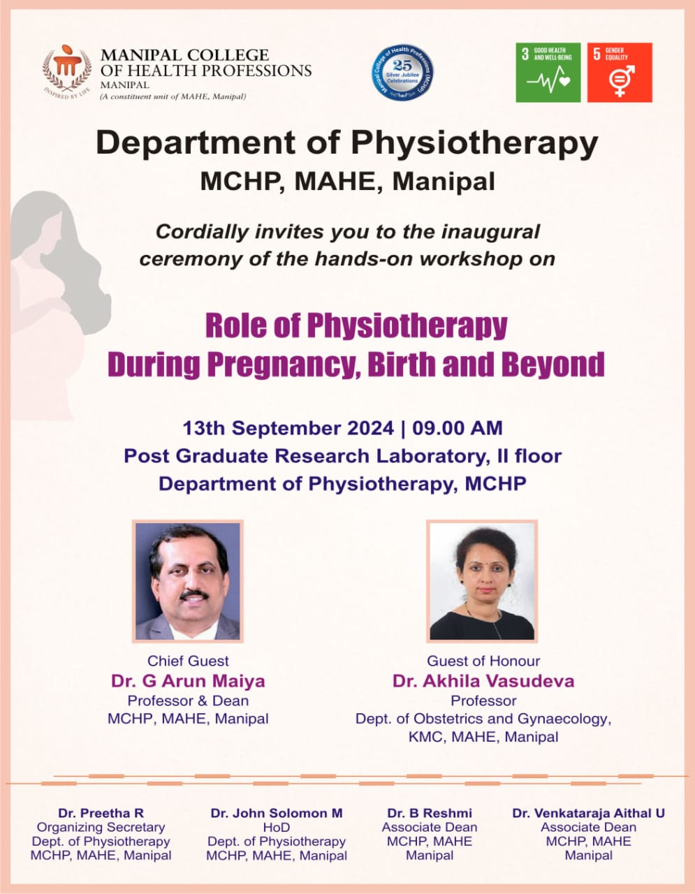 The Department of Physiotherapy, MCHP Manipal organized a two day workshop on "Role of Physiotherapy during Pregnancy, birth and beyond" on the 13th and 14th of September 2024. The inaugural function was presided by Dr G. Arun Maiya, Dean MCHP as Chief Guest and Dr. Akhila Vasudeva, Professor at the Department of Obstetrics and Gynaecology, Kasturba Medical College Manipal as Guest of Honour. The resource persons for the workshop were Dr. Preetha R, Associate Professor, Department of Physiotherapy, MCHP Manipal, Ms. Sriharika Jammula, Assistant Professor, SIMS College of Physiotherapy Guntur, Andhra Pradesh and Ms. Deanne Misquita, Physiotherapist and Lactation consultant at Fernandez hospital -Built for birthing.