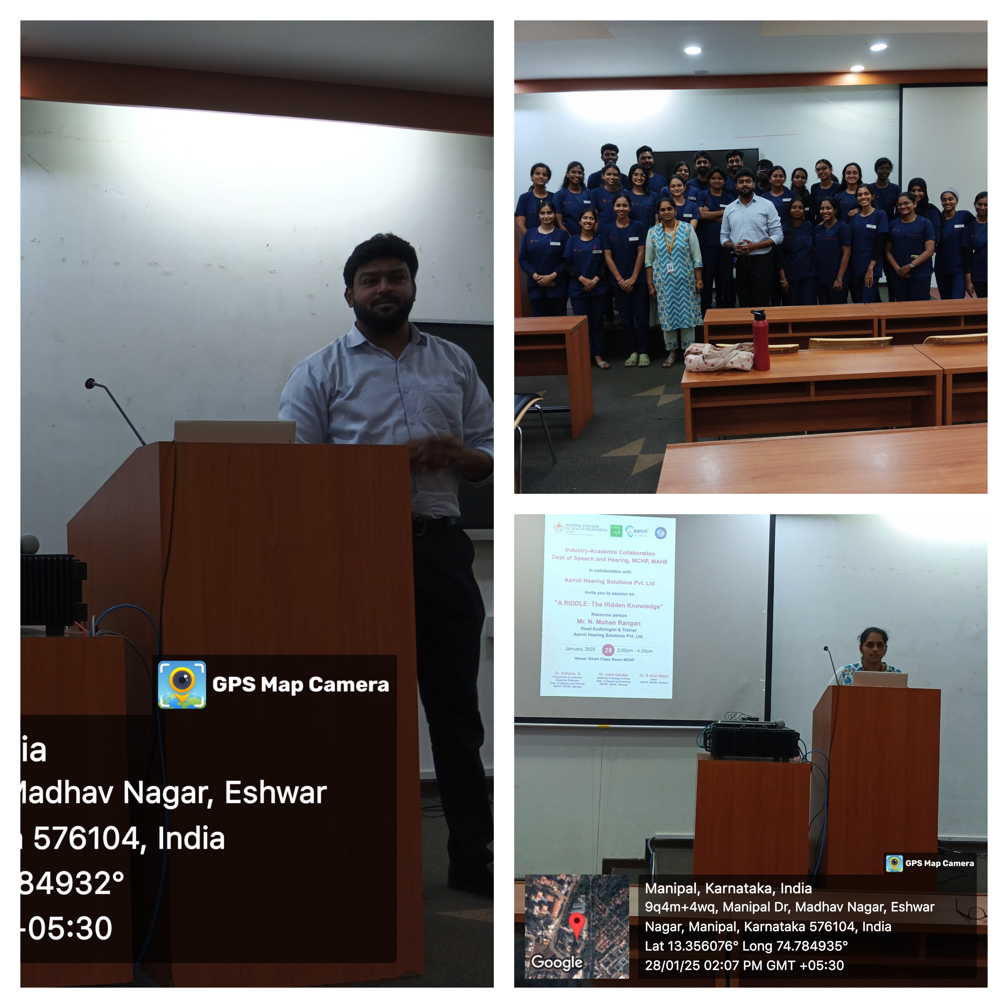 The Department of Speech and Hearing, in collaboration with Aanvii Hearing Solutions Pvt. Ltd., hosted a program titled "A RIDDLE: The Hidden Knowledge" for BASLP interns and second-year MSc Audiology students on January 28, 2025, from 2:00 PM to 4:30 PM in the Smart Classroom at MCHP. During the session, Mr. N. Mohan Rangan, Head Audiologist and Trainer from Aanvii Hearing Solutions Pvt. Ltd., addressed the students on the topic of the pathophysiology and types of presbycusis. He also provided detailed information on analyzing patient attitudes and effective counseling strategies based on those insights. The overall session was interactive, and the students responded positively, expressing their eagerness to attend similar events in the future. The program was coordinated by Dr. Archana G., Associate Professor, under the leadership of Dr. Usha, Additional Professor and Head of the Department of Speech and Hearing.