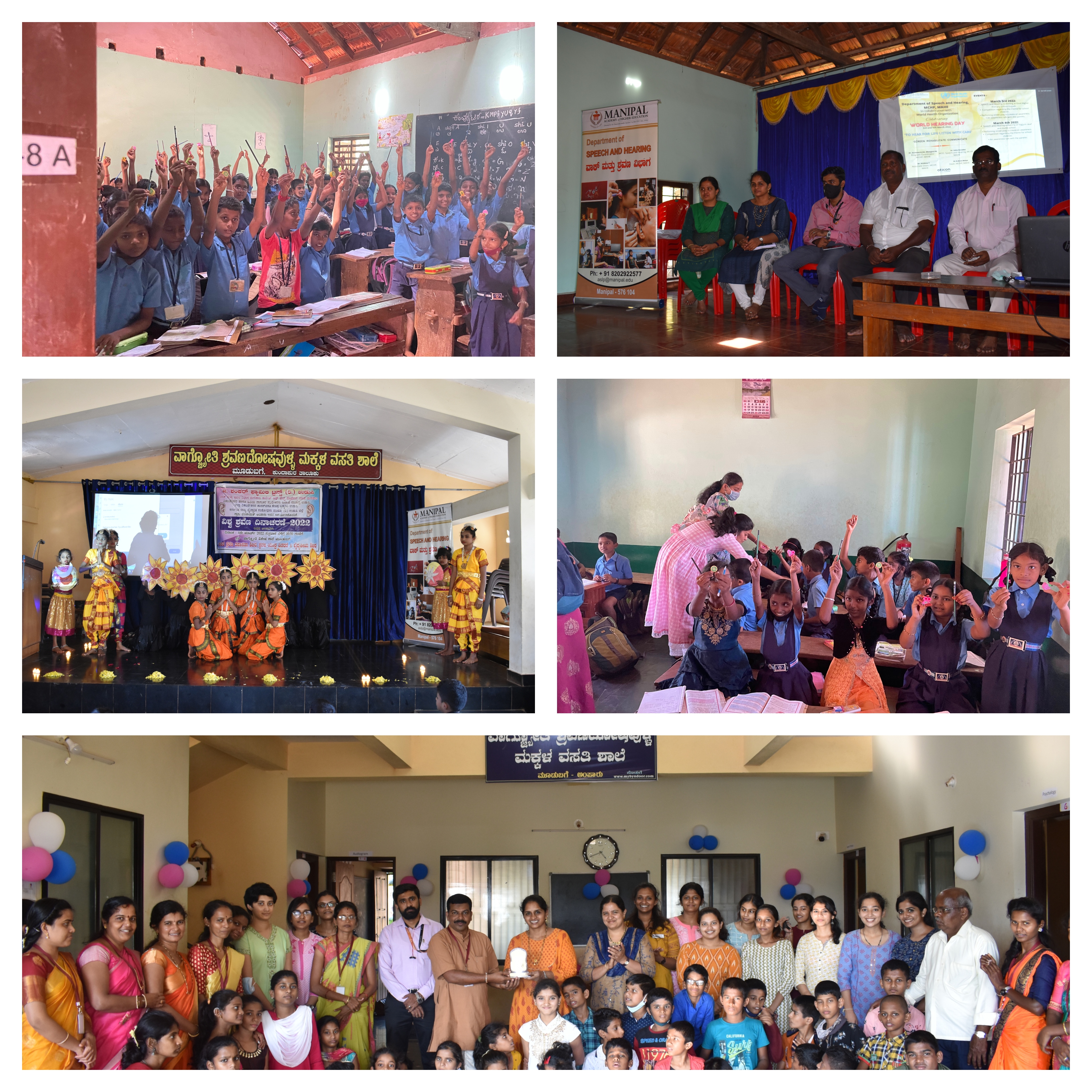 Dept. of Speech & Hearing, MCHP, MAHE has commemorated World Hearing Day on 3rd and 4th March 2022 with support from Oticon hearing aid solution in association with World Health Organisation. Based on the theme put forward by World Health Organization which is “Hear for life, listen with care” the department took an initiative by organizing a speech and hearing screening camp at the Government Higher Primary School, Gujjadi. Along with these speech and hearing evaluations, hearing aid troubleshooting, and fitting of hearing aid were carried out in Vagjyothi special School, Amparu. In both schools' awareness, the talk was given separately for Children, Parents, and teachers on the importance of early identification of hearing loss and tips on hearing care. The video of a street play was screened, which highlighted the awareness of problems faced by persons with hearing impairment, the importance of early intervention, and how hearing loss affects the Quality of Life. Department had conducted competitions for school children (Collage competition and Drawing competition) as per theme and attractive prizes were given for the winners. Overall, 400 children were addressed in these programs. All in all, the department put forward in making this event a success with an aim of social awareness and welfare.