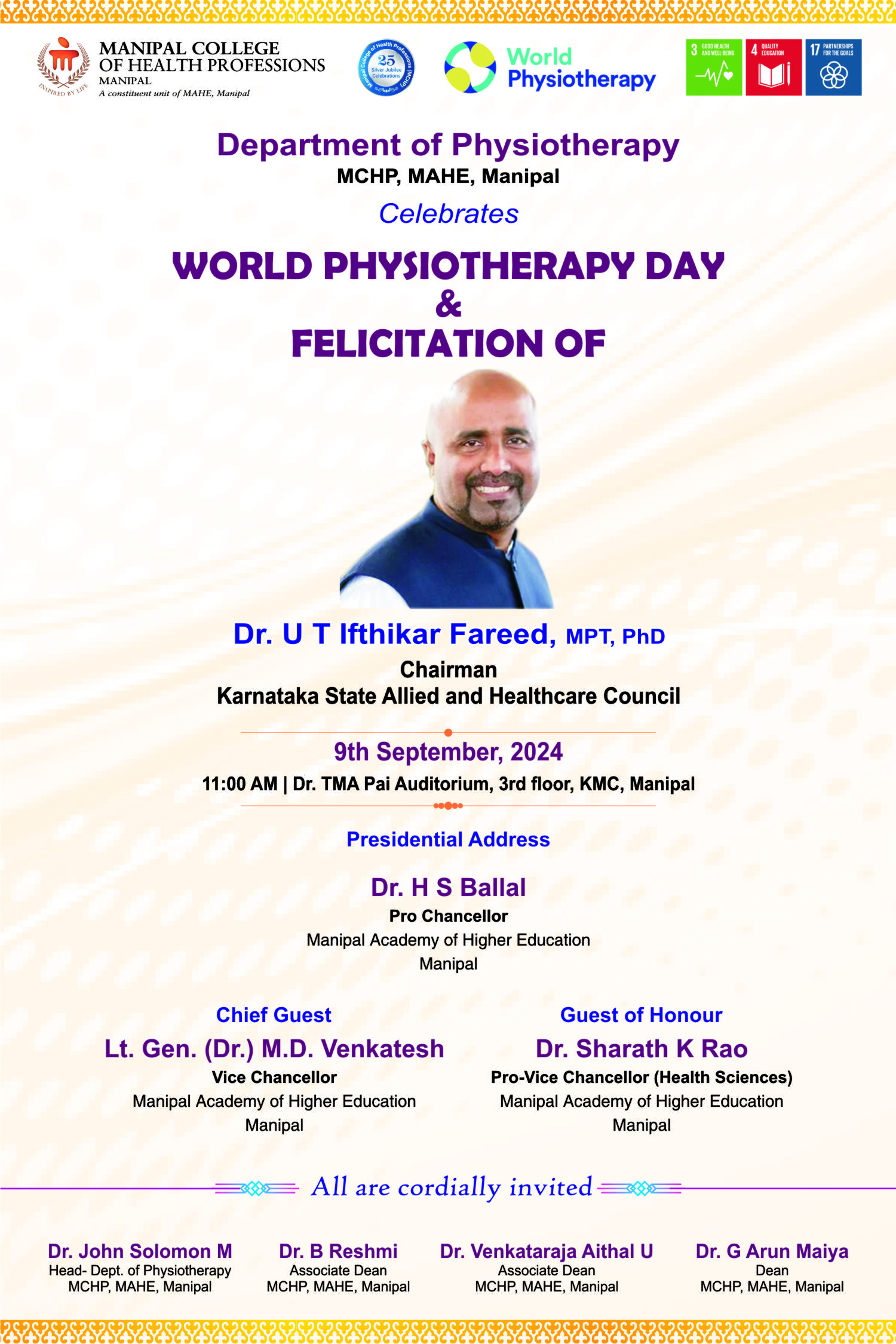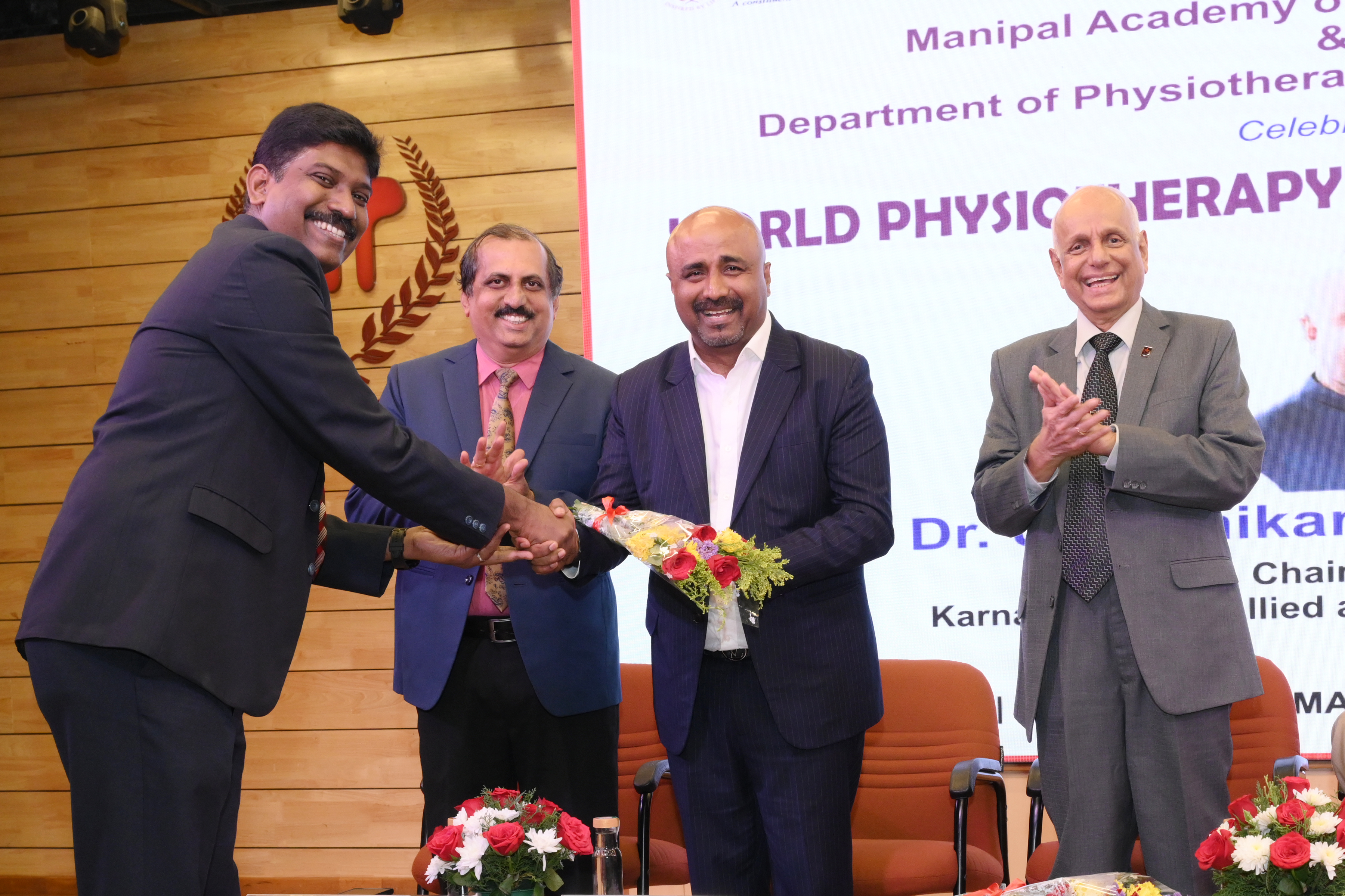 Manipal Academy of Higher Education, Manipal College of Health Professions and Department of Physiotherapy felicitated Dr. U T Ifthikar Fareed on his appointment as Chairperson, Karnataka State Allied Healthcare Council on the occasion of World Physiotherapy Day celebrations. University officials from the Manipal Academy of Higher Education, Pro Chancellor Dr. H.S. Ballal, Vice Chancellor Lt. Gen Dr. M.D. Venkatesh, Pro Vice Chancellor (Health Sciences) Dr. Sharath K Rao, Pro Vice Chancellor (Mangalore Campus) Dr. Dilip G. Naik and the Dean of MCHP Dr. G. Arun Maiya honored Dr. Fareed on the occasion.