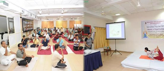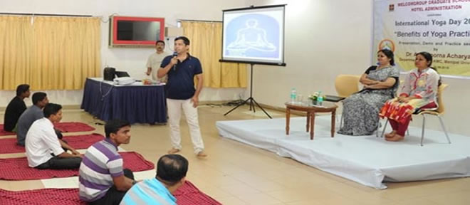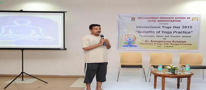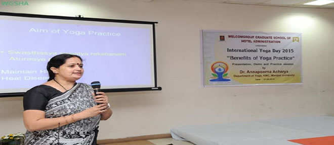International Day of Yoga 2015 was celebrated at WGSHA for faculty and staff. Dr. Annapoorna Acharya, KMC Manipal was resource person and Dr. Deepa for demonstration. The program was conducted under the guidance of the Pricnipal Prof. G Parvadhavardhini and coordinated by Mr. Ramdas - HR Executive Vice Principal Mr.Thiru welcomed the gathering, faculty Raghavendra G delivered the vote of thanks.