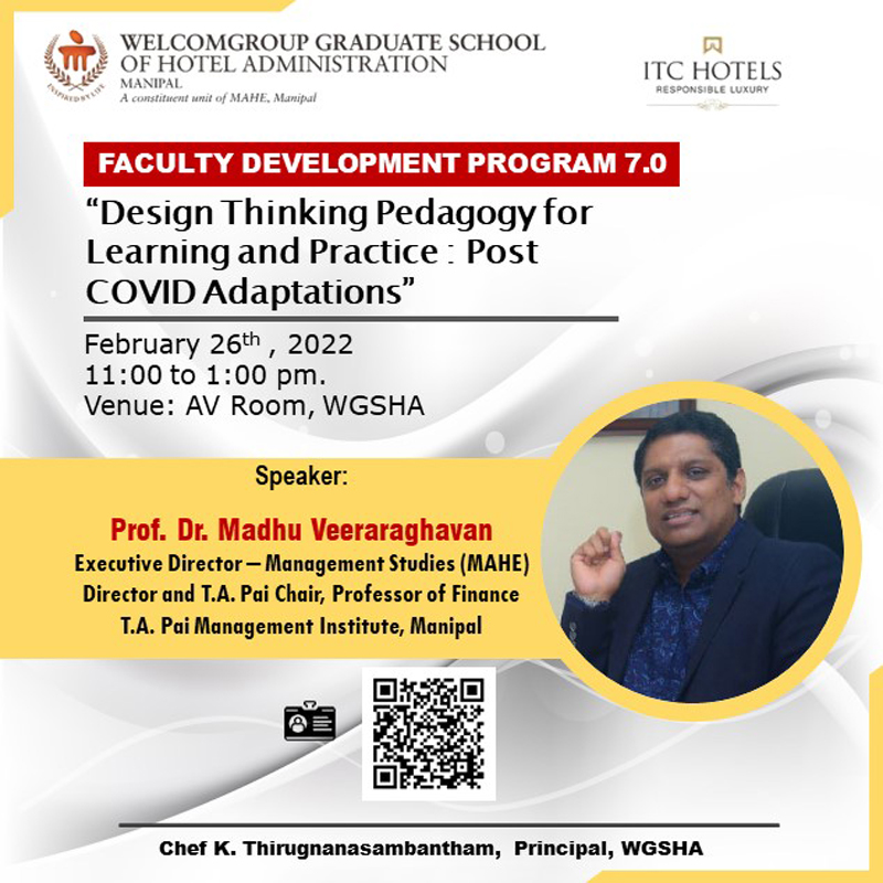The 7th edition of faculty development program (FDP) will be organized on Saturday, 26th February 2022 at WGSHA. It is our privilege to have Prof. Dr. Veeraraghavan Executive Director – Management Studies (MAHE), Director and T.A. Pai Chair, Professor of Finance, T.A. Pai Management Institute, Manipal as the resource person to conduct the session. It is an off-line session held in AV Room, WGSHA between 11 AM and 1 PM.