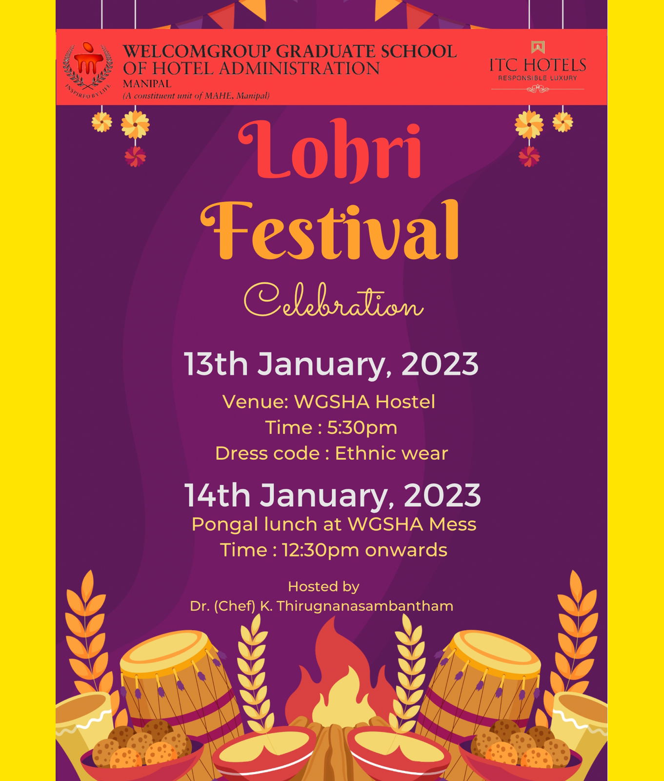 On behalf of the Principal Dr. (Chef) K Thiru, we are delighted to invite you to the Lohri hostel festival on 13th of January 2023 at 5.30PM at WGSHA mess. All are cordially invited for the event.