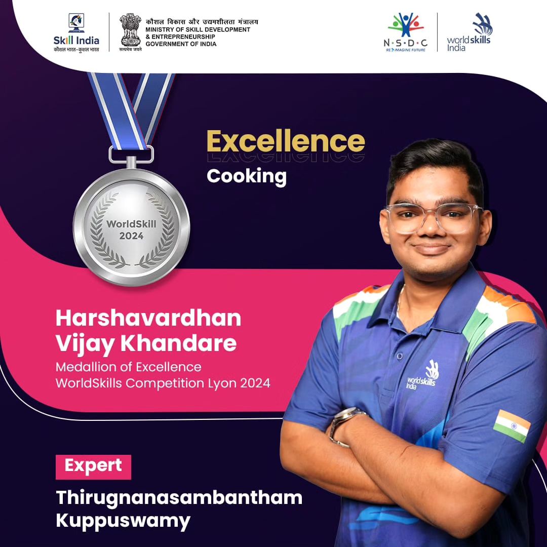 WGSHA is pleased to announce that our student, Mr. Harshavardhan Vijay Khandare (11th Course BA Culinary Arts), has won the prestigious Medallion of Excellence in the Cooking Category at the World Skills Competition 2024 held in Lyon, France. This is the first time India has received this prestigious honor in the cooking skill category. He has been mentored under our Principal, Dr. Chef K Thiru, the Chief Expert for Team India in Cooking Skill 2024. Receiving the honor after an intense competition among 43 countries is truly an achievement for all of us. WGSHA is proud of our alumnus for this historic victory!